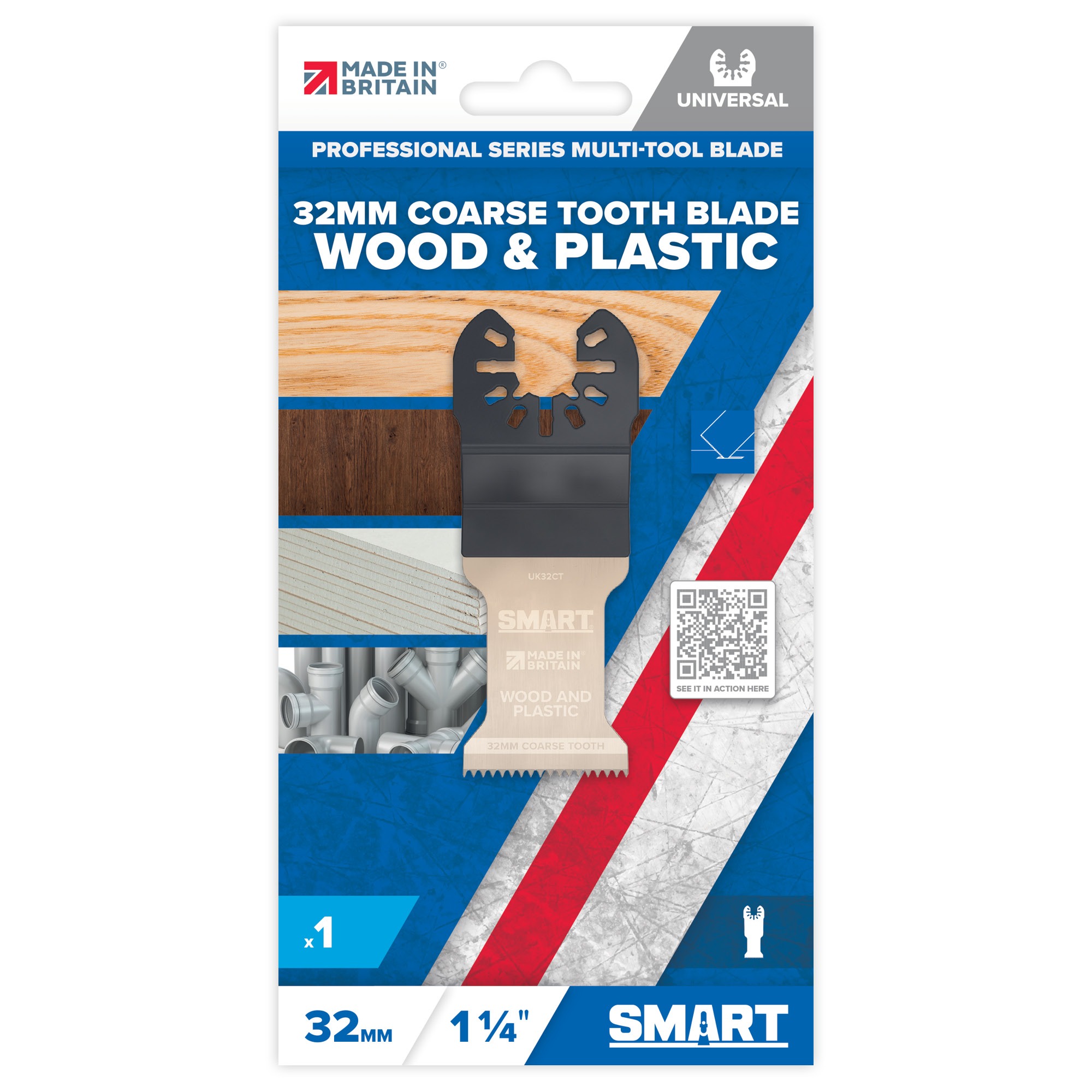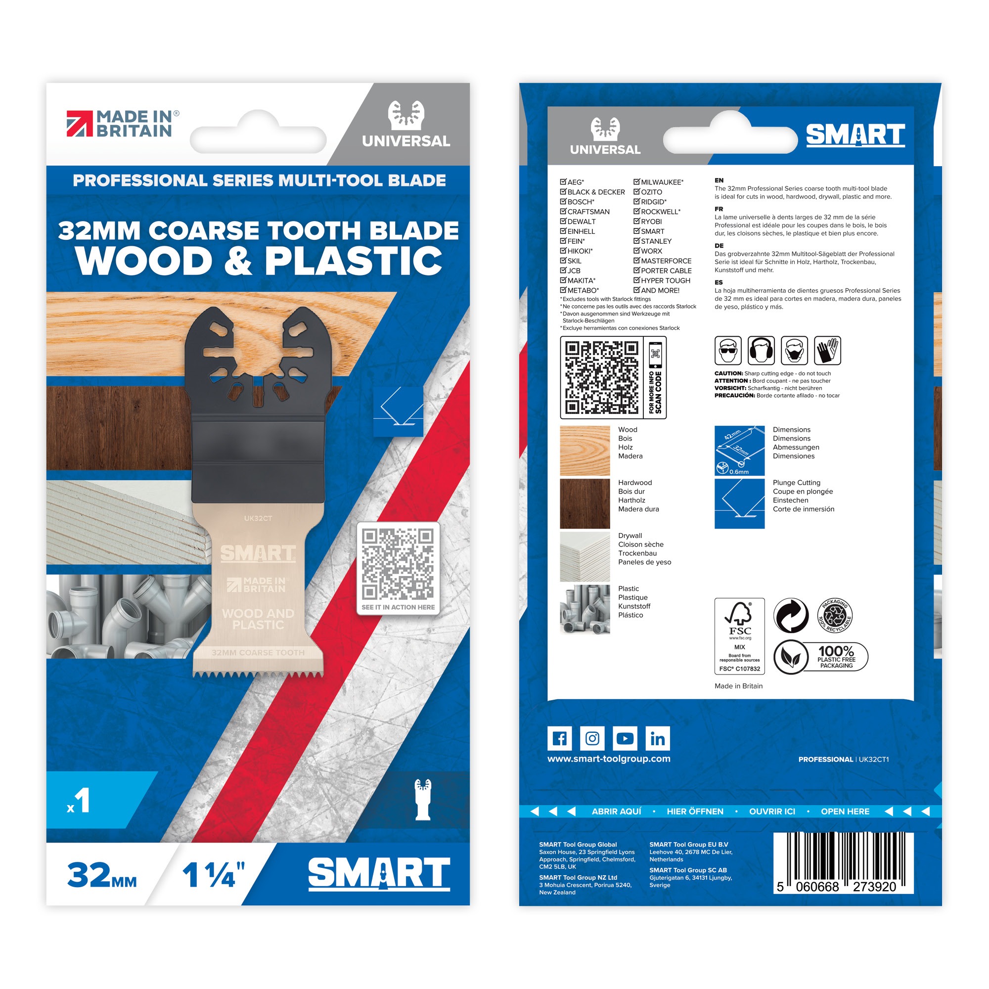 A Professional Series coarse tooth multi-tool blade for a wide variety of cuts in wood, hardwood, plastic, drywall, timber overlay flooring and more. The coarse toothing is versatile, enabling fast yet precise cuts in all suitable materials and the blade width allows for smaller detailed trimming and plunge cutting. Made in Britain.