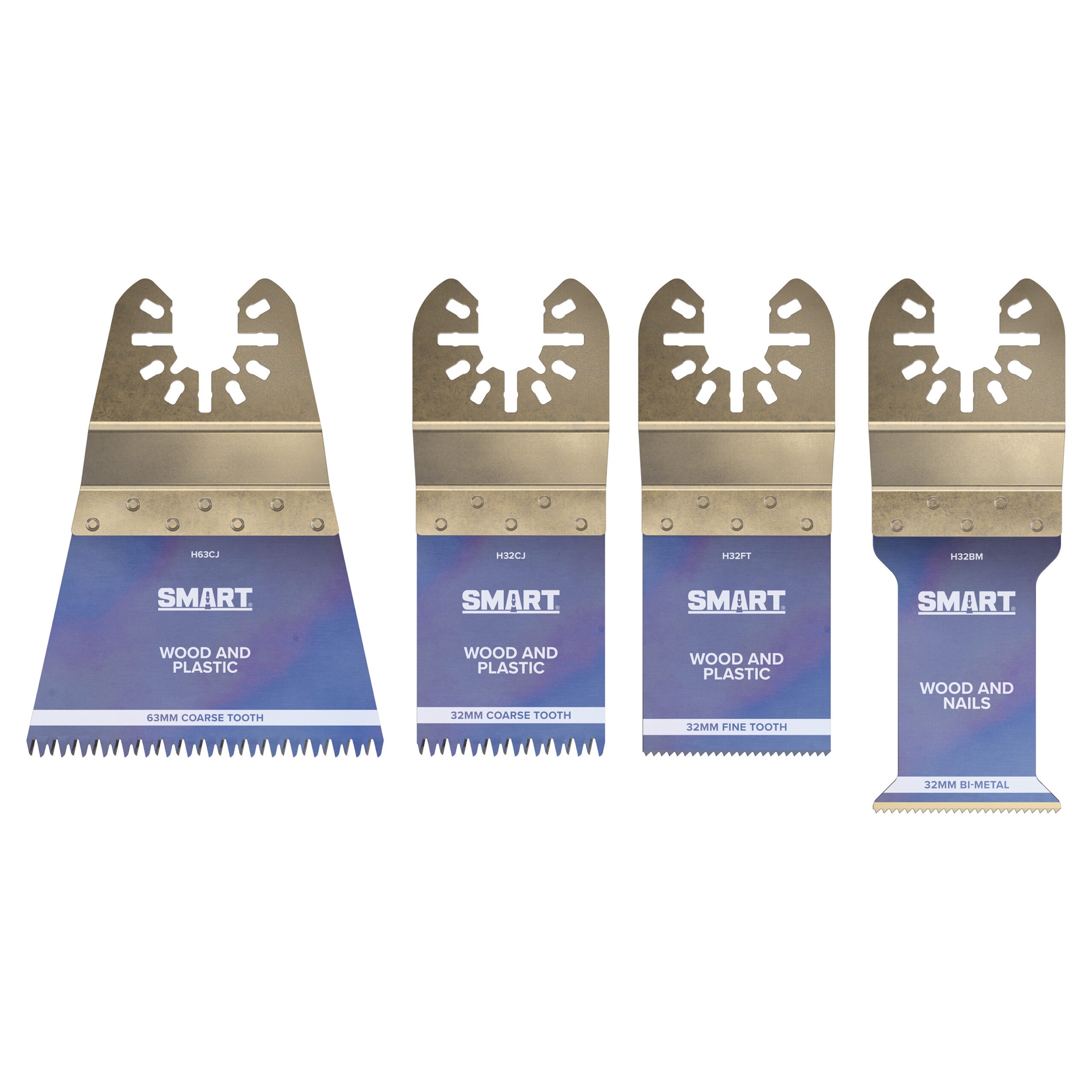 A great Trade Series assortment of the four most commonly used multi-tool cutting blades, perfect for most everyday multi-tool applications. Suitable for a wide range of cutting applications including wood, hardwood, plastic, drywall, non-ferrous metal and nails.